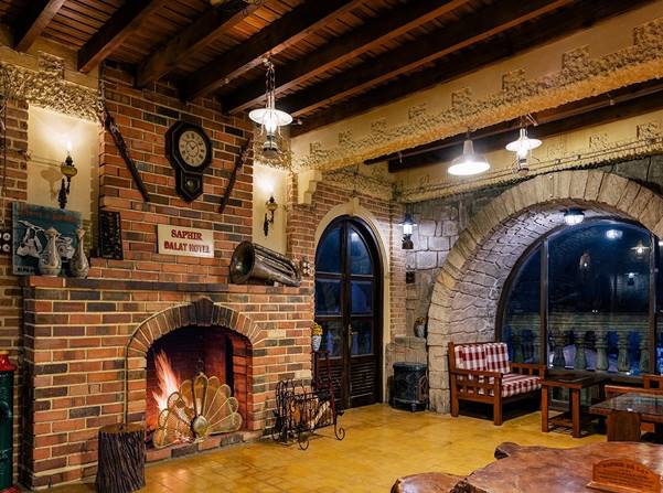Từ ngoài nhìn vào, Saphir như một tòa lâu đài cổ với thiết kế màu cam nổi bật. Từ khoảng sân cho đến không gian bên trong khách sạn đều được trưng bày những cổ vật được sưu tầm từ rất lâu. Nội thất bên trong đa số được làm bằng gỗ mang đến một không gian sang trọng, ấm cúng, đặc biệt là vào những đêm Đà Lạt lạnh gió.